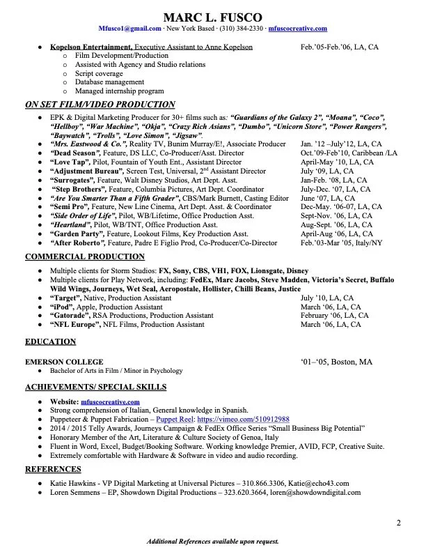 Marc Fusco graduated from Emerson College with a BA in Film and Minor in Psychology. He is a member of good standings with Local 871 IATSE and has received numerous awards for his accomplishments in Film including an honorary induction into the Art, Literature & Culture Society of Genoa, Italy.